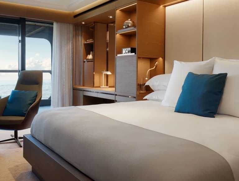 房間皆提供 24 小時餐飲服務、濃縮咖啡機、免費咖啡與茶飲,以及精心準備、符合您口味的迷你吧。獨家尊榮服務讓您每一刻的船上時光都舒適而尊貴。