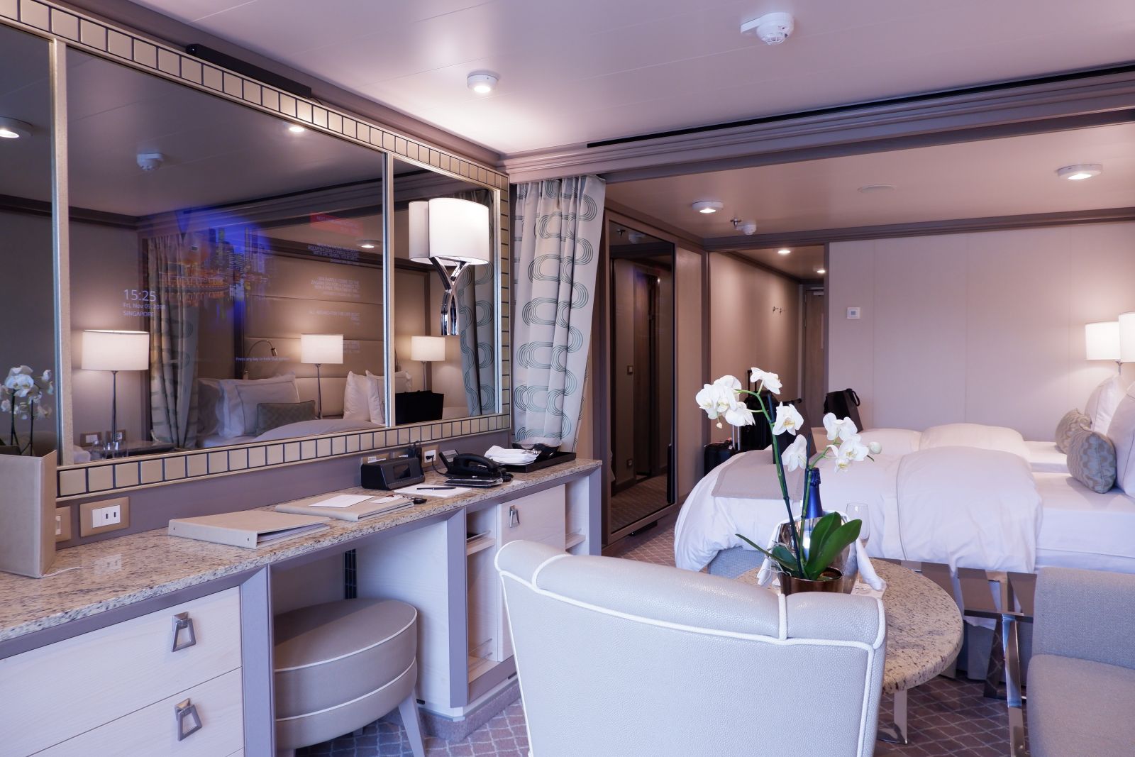 今晚,我們入住Deluxe Veranda Suite,這是帶陽台的基本房型,集中在最穩定的船身中央,正好適合容易暈船的我們!香檳色為主的空間明亮又優雅,還有舒服的陽台、沙發區、梳妝台、一張大床(或兩張單人床)、一個步入式衣櫃、兩個隱藏在鏡子裡的多功能電視,還有一個寬敞的大理石浴室。